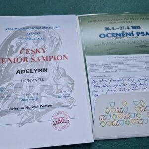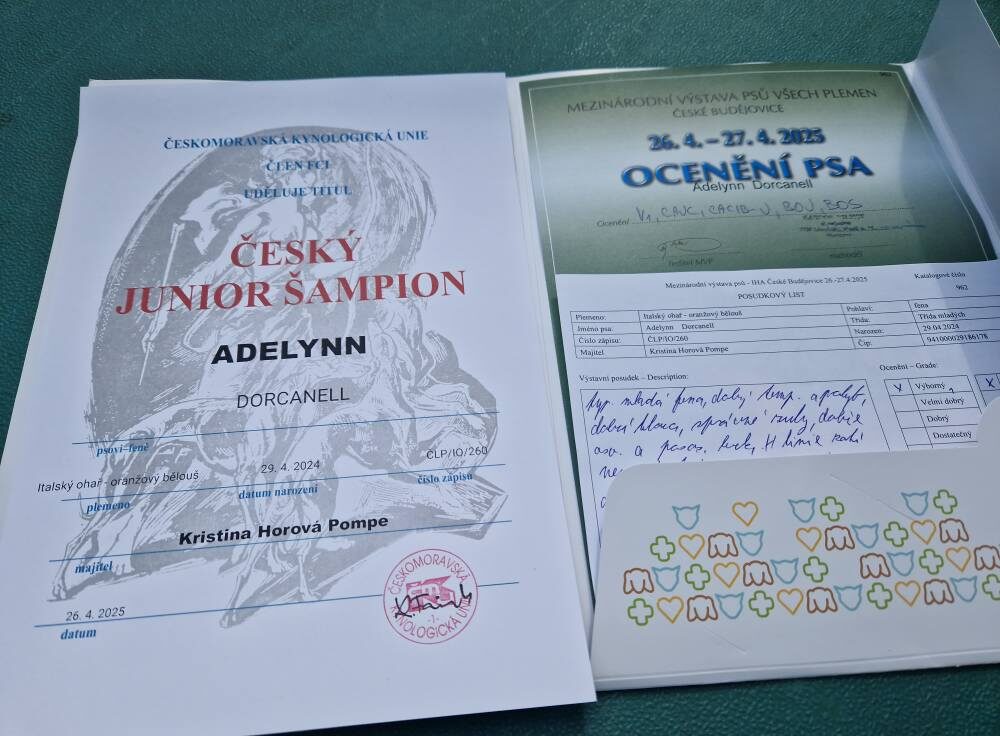 Dub 26 2025 Off MVP České Budějovice 26.4.2025a náš odchovánek Adelynn Dorcanell alias Gigi si se svou paničkou vyběhala nádherné oceněníV1, CAJC, J-CACIB, BOJ, BOSTímto naše prvorozená stračena splnila podmínky pro udělení titulu Junior Šampion ČR – zatím první a jediná šampionka z našich 19 andílků Děkuji majitelce, jsem na vás moc pyšná… Navigace pro příspěvek Předchozí článekPředchozí Výstava ohařů při EDS Brno – 12.4.2025Následující příspěvekNásledující Ayra u kadeřníka