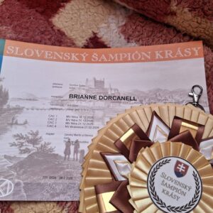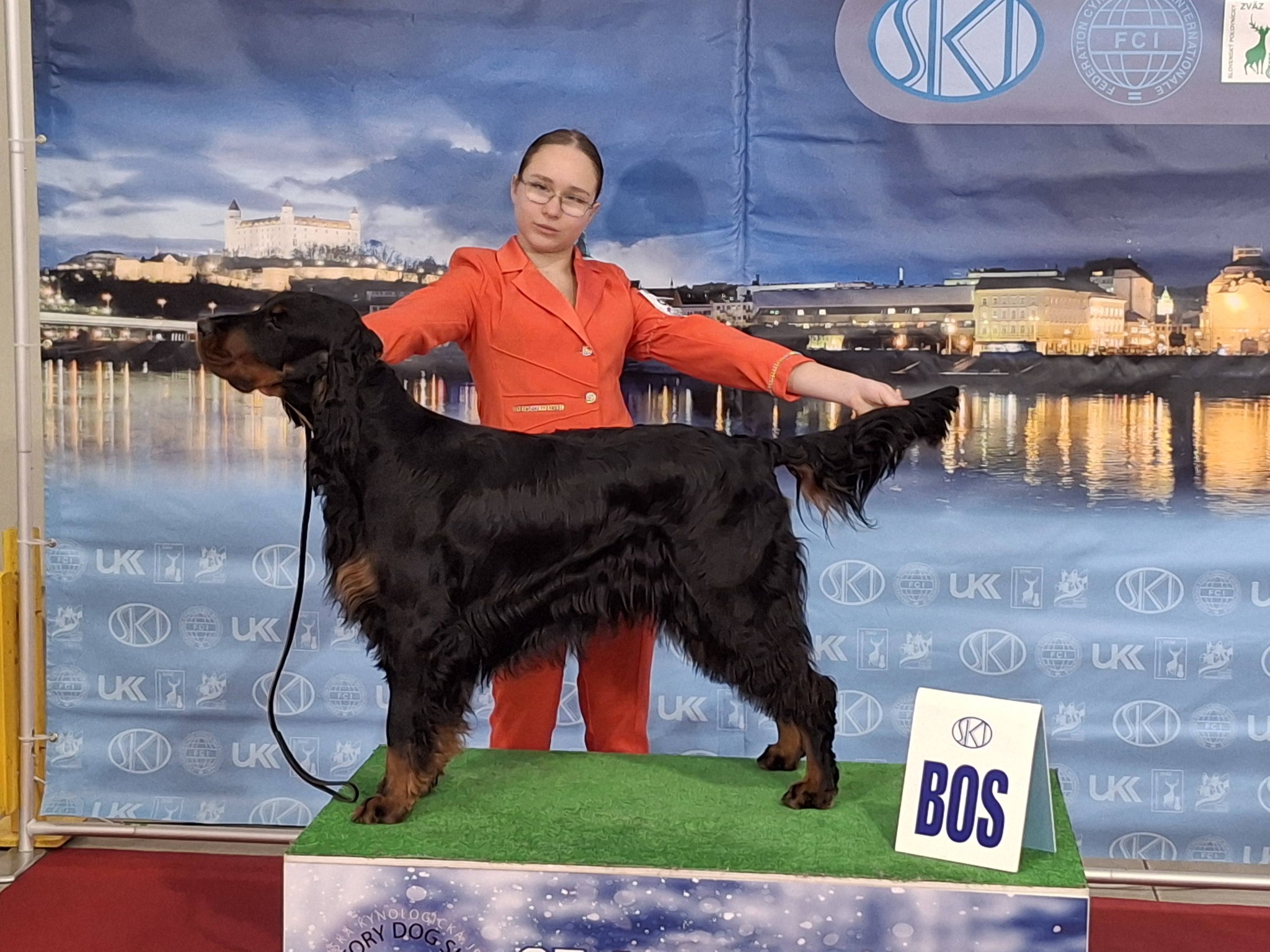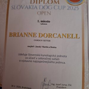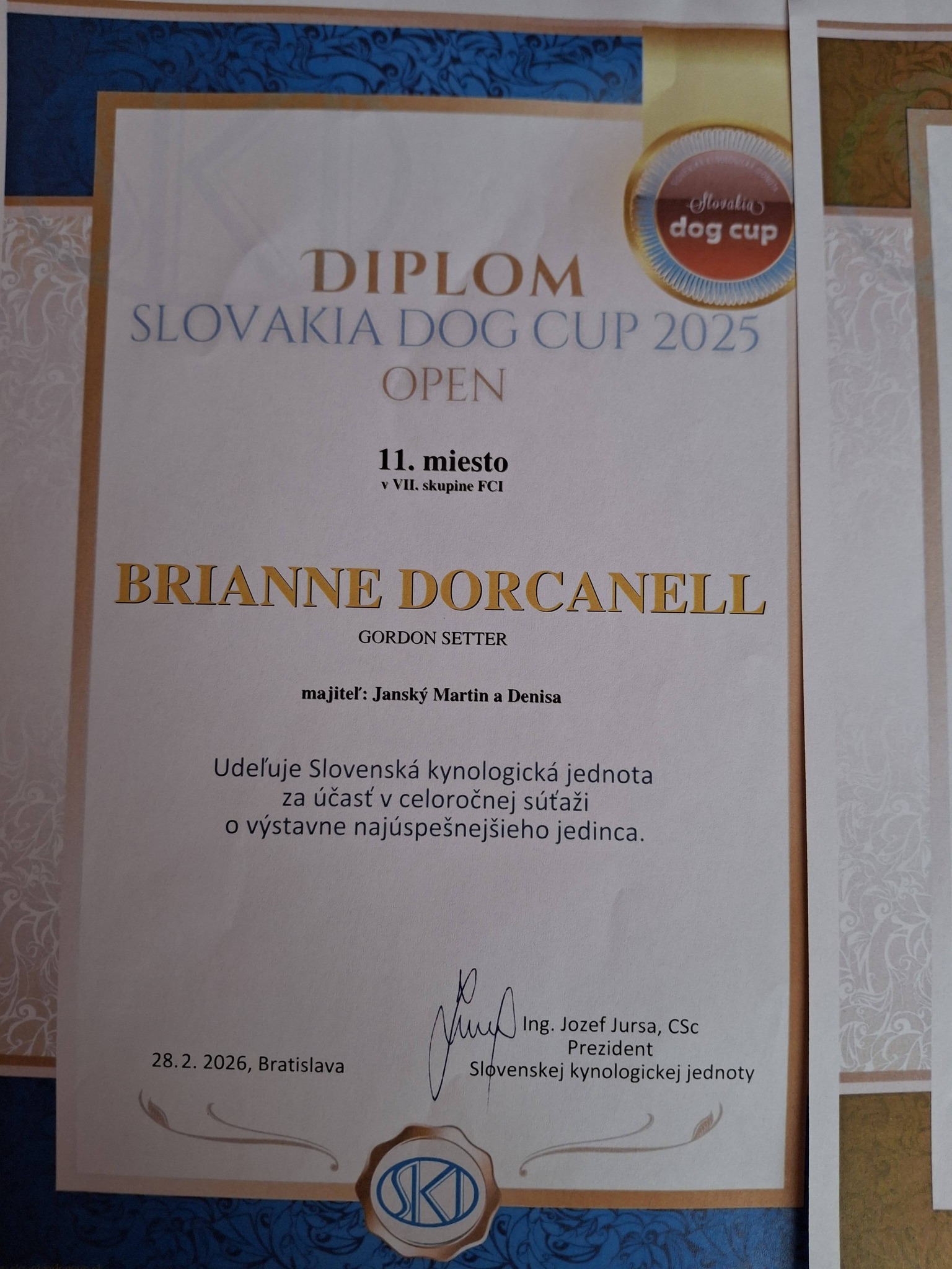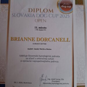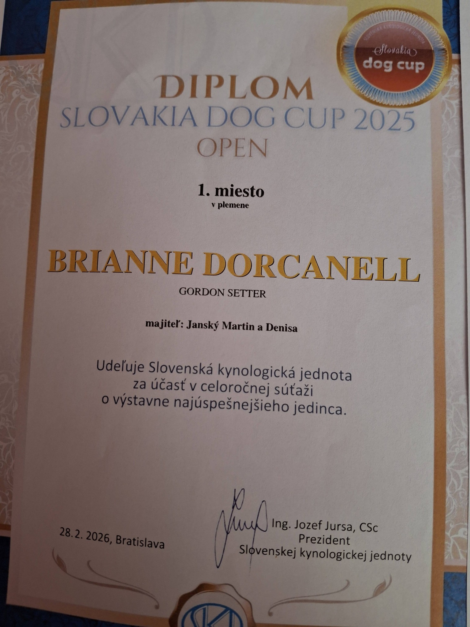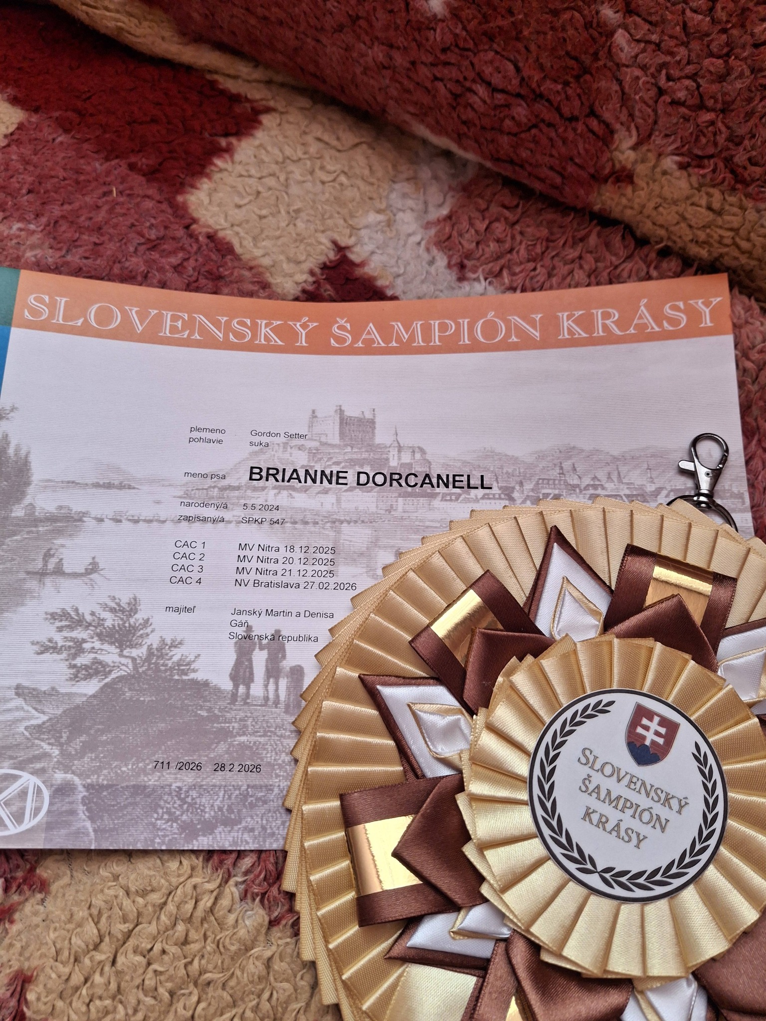 Úno 28 2026 Off náš odchovánek BRIANNE DORCANELL V piatok 27.2.2026 Narodna vystava Bratislava Vyborny 1, CAC, BOS, Vitaz Slovenska V sobotu 28.2.2026 MV WINTERDANUBE CACIB Vyborny1, CAC, res.CACIB Brianna se stala Slovenským šampionem krásy v necelých 2 letech. V soutěži dog cup Slovakia 2025 se Bria umístila na 11. místě ve své skupině FCI VII. a na 1. místě v plemeni.Moc gratulujeme, jen tak dál Navigace pro příspěvek Předchozí článekPředchozí Ayra a Dylan – máme nakrytoNásledující příspěvekNásledující Ayra a Dylan – Březost potvrzena :)